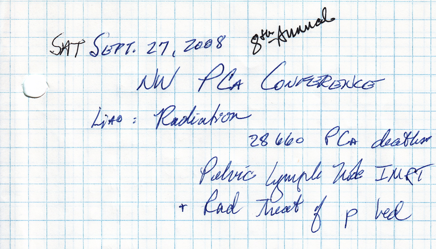 I must admit, however, that I’ve sometimes felt that much of the discussion was intended for others, not me. At the 8th conference, for example, on Sep 27, 2008, I scratched this fragment in my notebook: “Pelvic Lymph Node IMRT + Rad treat of p bed.” I just didn’t pay enough attention to take further notes of elaboration, what it all meant and why the topic was in play. It just didn’t apply to me and never would.